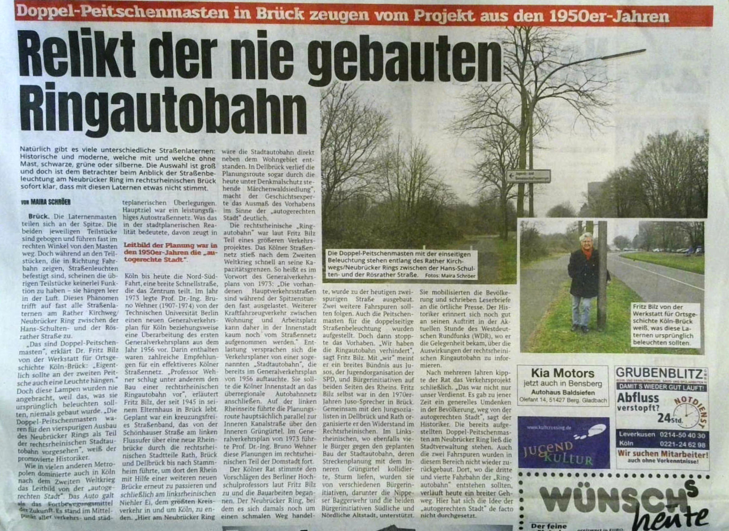 In der EXPRESS – Die Woche erschien am 27.12.2024 ein Artikel, dessen Inhalt aus der Feder unseres Mitglied Fritz Bilz stammt. An die Geschichtswerkstatt war vor einigen Wochen eine Anfrage ergangen, ob für das neue Köln-Buch „Kölner Geheimnisse Band 2 “ der Autoren Ayhan Demirci und Maira Schröer eine geeignete Geschichte existieren würde. So nahm der folgende Artikel seinen Anfang. Fritz Bilz schrieb über die merkwürdigen Laternenmasten in Neubrück, dass damals noch zu Brück gehörte und „Adenauer-Siedlung“ genannt wurde.