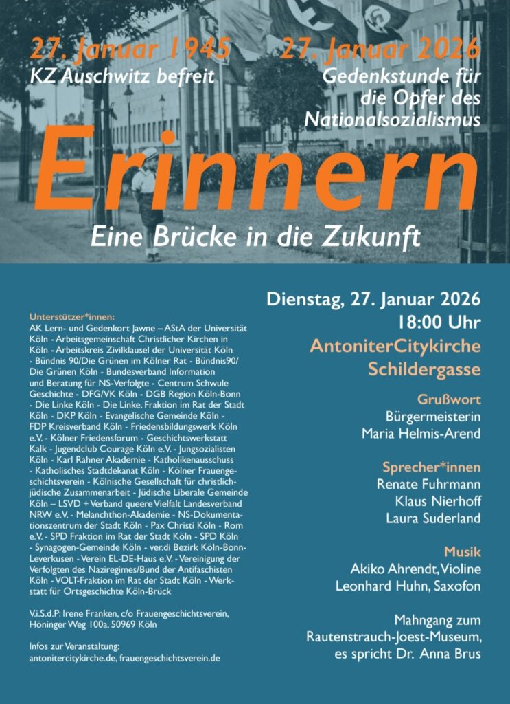 Wie jedes Jahr fand die Gedenkveranstaltung für die Opfer des Nationalsozialismus am 27. Januar in der Antoniterkirche statt, an der die Geschichtswerkstatt als Mitveranstalter beteiligt ist. 2025 wurde an den 80sten Jahrestag der Befreiung des KZ Auschwitz erinnert.